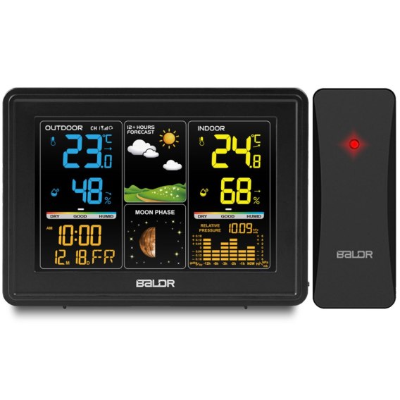 Bezprzewodowa stacja pogodowa BD-907 z kolorowym wyświetlaczem to nowoczesne urządzenie, które pozwoli Ci na bieżąco monitorować warunki pogodowe w domu i na zewnątrz. Dzięki synchronizacji czasu z sygnałem DCF77, prognozie pogody na 12-24 godziny oraz funkcji alarmów temperaturowych zawsze będziesz przygotowany na zmiany pogody. Stacja mierzy temperaturę, wilgotność, ciśnienie barometryczne oraz wyświetla trendy i historię pomiarów. Posiada kalendarz, budzik z drzemką, wskaźnik faz księżyca i poziomu komfortu powietrza. Kolorowy ekran LCD z regulacją podświetlenia zapewnia czytelność wszystkich danych, a dołączony czujnik zewnętrzny (zasięg do 60 m) umożliwia jednoczesny pomiar wewnątrz i na zewnątrz.